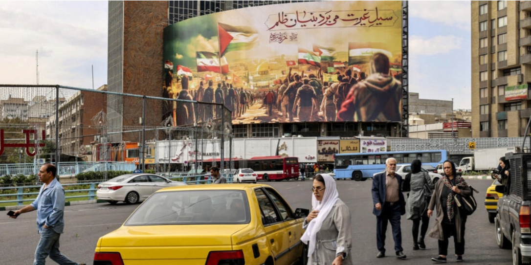 People cross a road near a giant billboard depicting Muslim peoples walking with their national flags towards the Dome of the Rock shrine in Jerusalem, erected in Valiasr Square in the centre of Tehran on October 25, 2023. © Atta Kenare, AFP